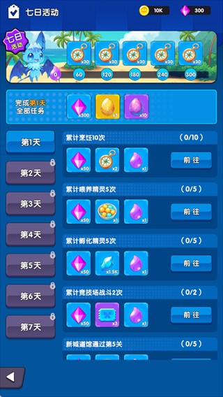 3、七日活跃任务:完成每日任务累计活跃度,可领取稀有精灵蛋、钻石及培养道具“黄金罗盘”;