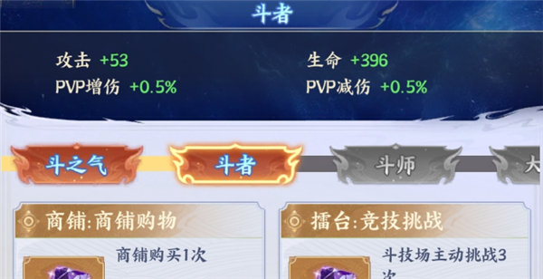 主角等级26级解锁,激活或升星【斗技】时,可产出【灵光】,收集【灵光】提升斗技等级,可为所有斗者角色提供属性加成。激活的【斗技】还可给斗者穿戴,穿戴后斗者会立刻享受到由【斗技】提供的各种效果,每一种【斗技】都可通过升星,来增强其穿戴后为斗者提供的增益效果。同一【斗技】可同时装备给多位斗者。玩家还可通过领悟功能,为斗者解锁更多的【斗技】穿戴孔位并让他们享受到斗技属性加成。